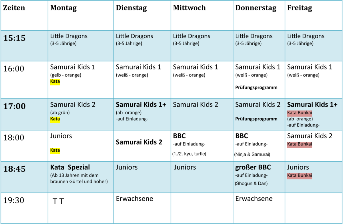 Sie oder Ihr Kind möchten wissen, wann der passende Karatekurs stattfindet? Hier finden Sie unseren aktuellen Stundenplan mit allen Trainingszeiten für Kinder, Jugendliche und Erwachsene oder als PDF zum Download.